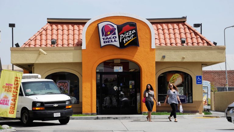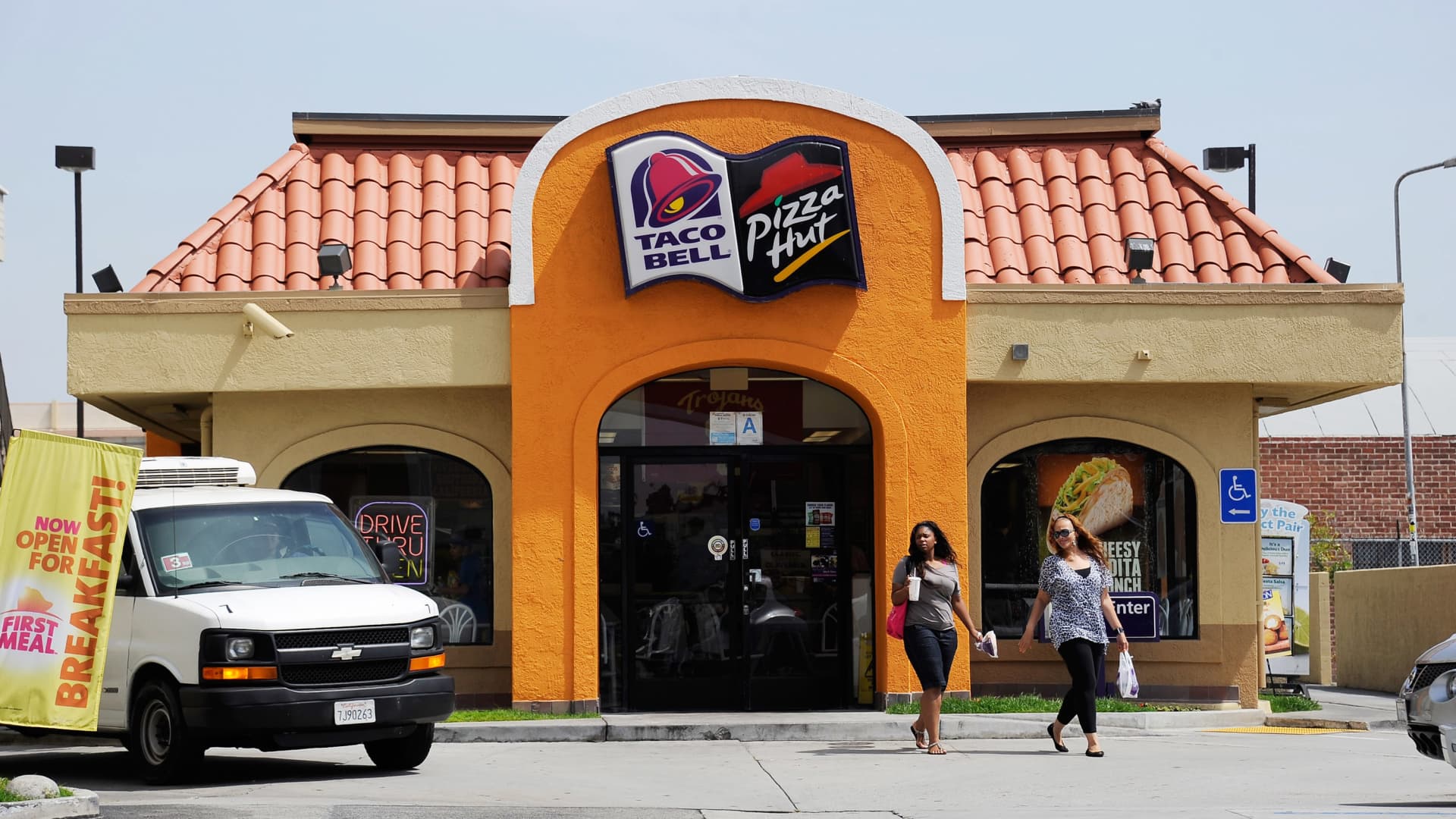 Customers leave a Taco Bell and Pizza Hut restaurant during lunch in Los Angeles, California.