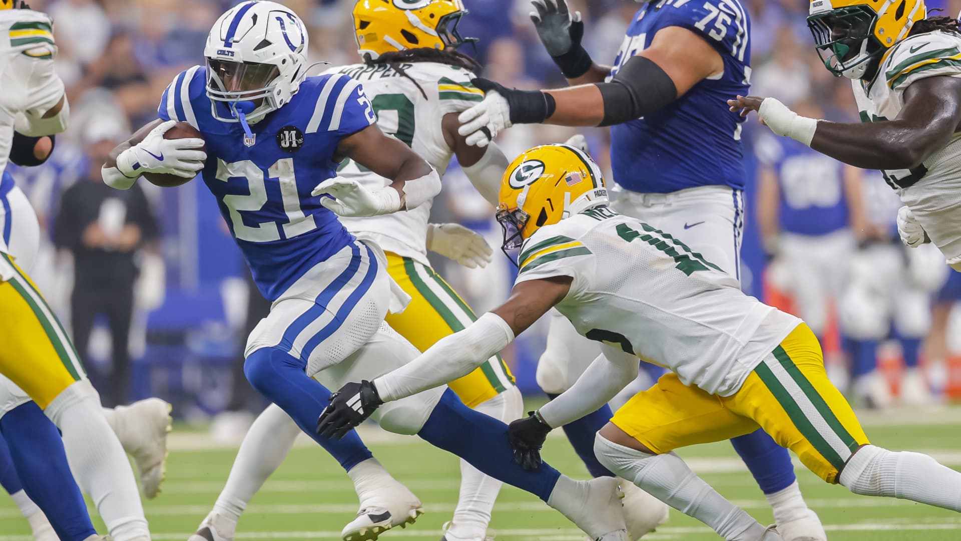 DJ Giddens, n ° 21 of the Indianapolis colts, directs the ball while Bo Melton, n ° 16 of the Packers de Green Bay, reached the tackle during the NFL 2025 pre-season match between the Packers of Green Bay and the Indianapolis Colts at Lucas Oil Stadium in Indianapolis, Indiana, August 16, 2025.
