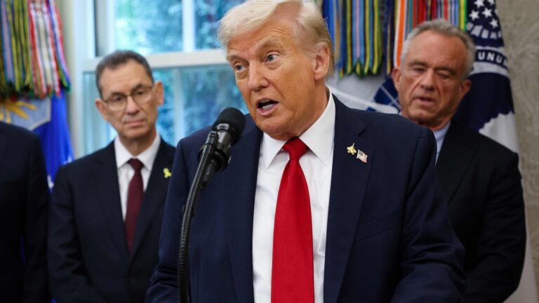 US President Donald Trump announces an agreement with Pfizer to reduce Medicaid drug prices in the White House Oval Office on September 30, 2025 in Washington, DC.