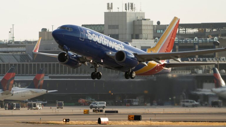 A Southwest Airlines plane takes off from Minneapolis-Saint Paul International Airport in Minneapolis, Minnesota, United States, November 7, 2025.